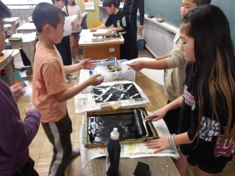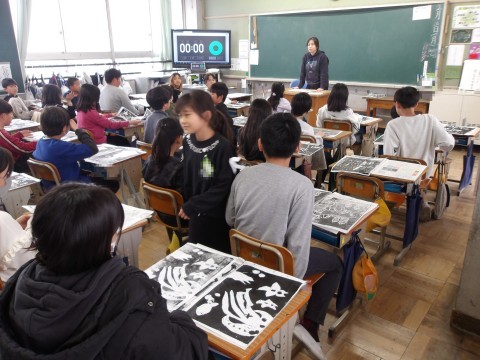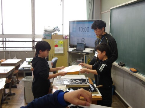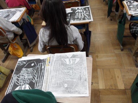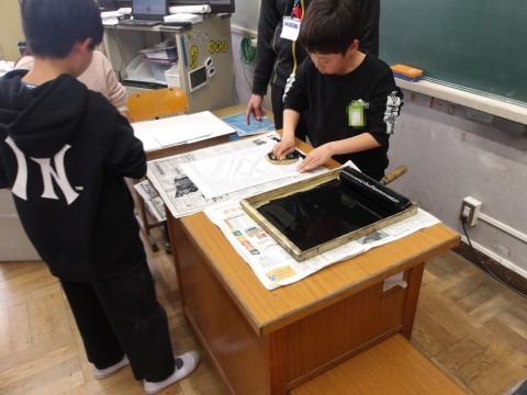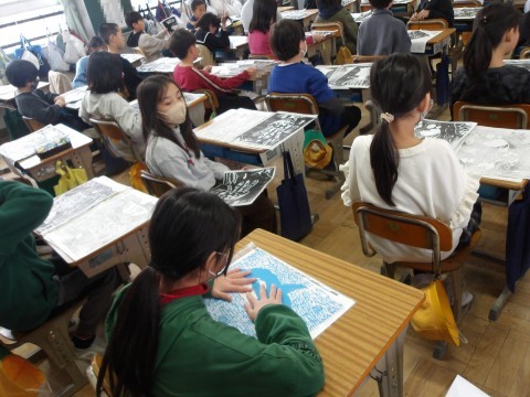 図工「らくかる版画」では,彫刻刀を使用して,海の生き物を描きました。版画を刷って完成です。思っていた通りの仕上がりで海の様子が表現できていたかな?