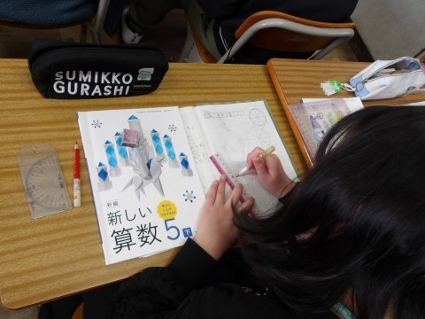 算数では,正多角形の性質を使って円周の長さと直径の長さの関係を調べていきます。