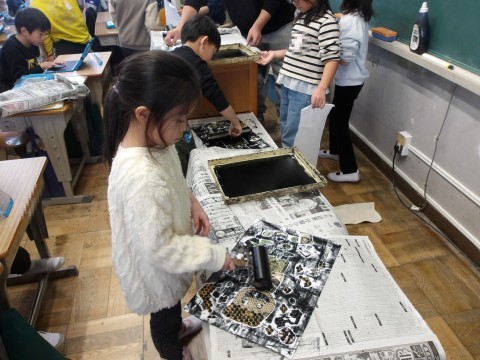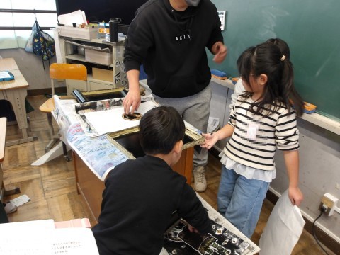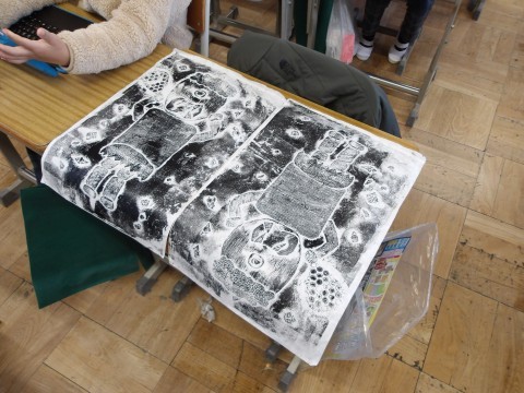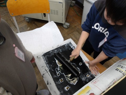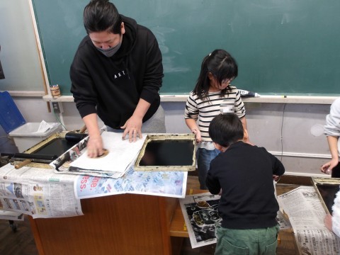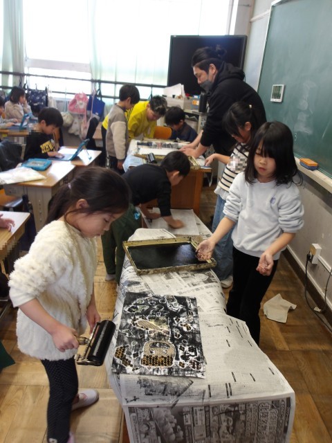 図工では,仕上げた作品の版画を刷っています。上手にできましたね。