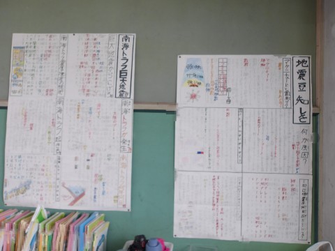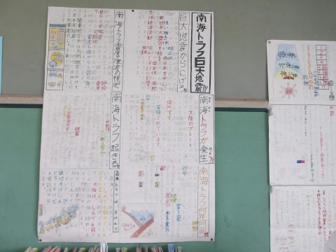 総合的な学習の時間に取り組んだ防災教育では,調べたことを分かりやすく伝える新聞を制作しました。完成し,教室内に掲示しています。参観の際に,ぜひご覧ください。