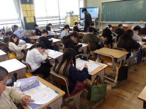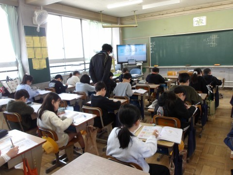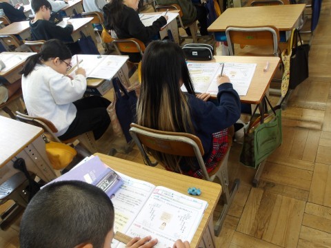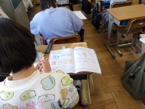 算数では,小数のわり算の計算問題に取り組んでいます。慌ててはいけませんよ,小数点を受け忘れないように。