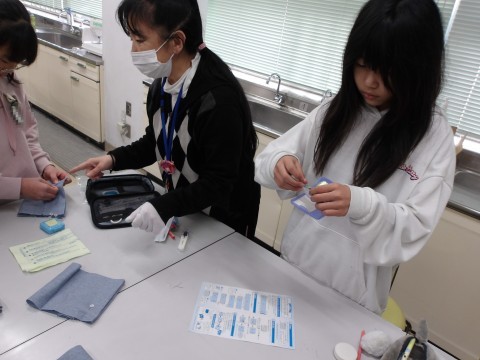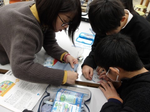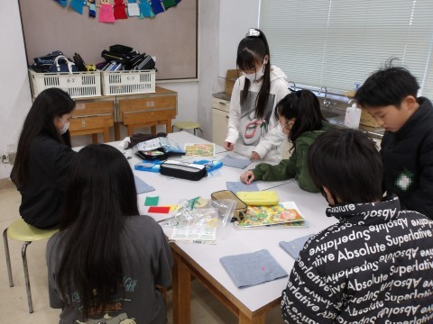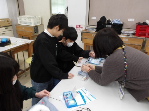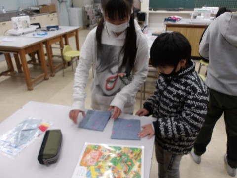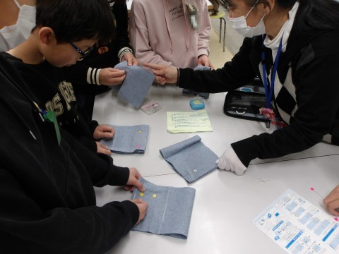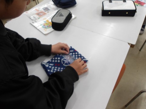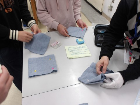家庭科では,「ティッシュポーチ」を制作します。生地を折って待ち針を打ち,縫うための準備をしています。