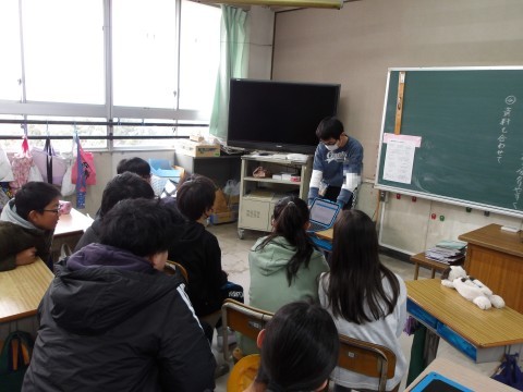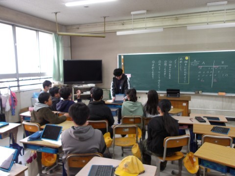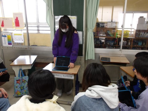 国語では,自分のお気に入りの言葉や詩,名言について友だちに伝えます。今日は,まとめたものを発表しています。相手の方を見て聞こえる声で,ゆっくりとはっきりとわかりやすく話します。用意した資料も使って伝えます。