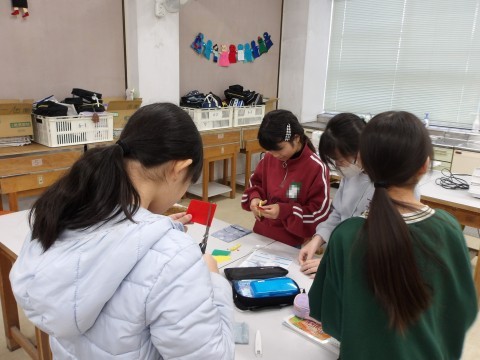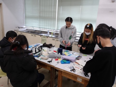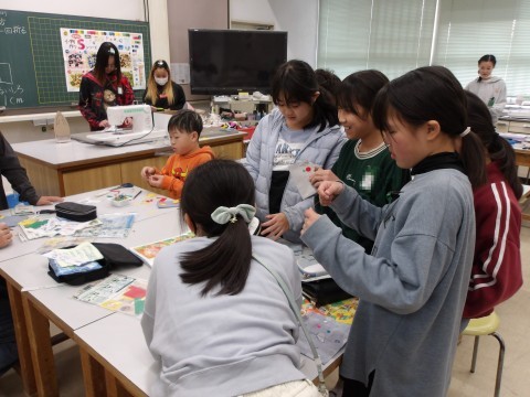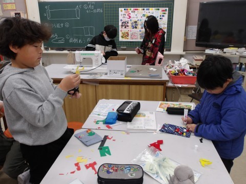 家庭科では,テッシュポーチを作っています。集中して,楽しみながら取り組んでいます。