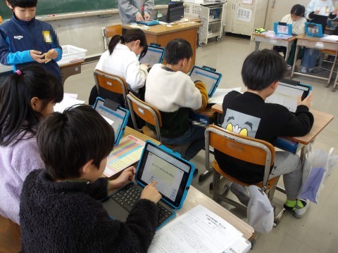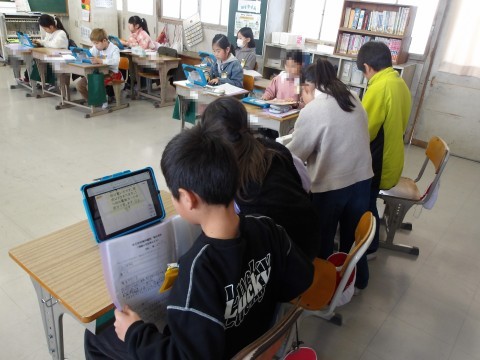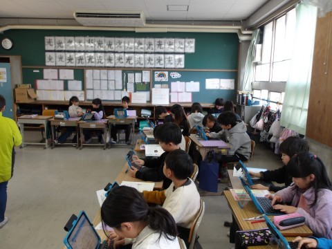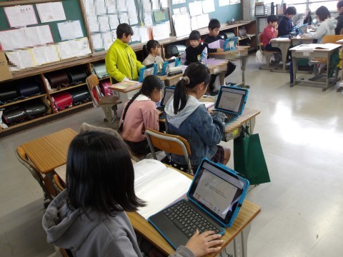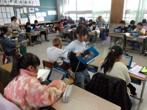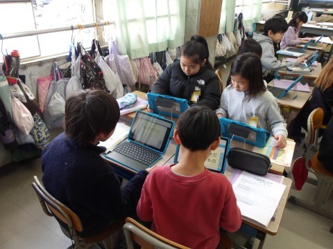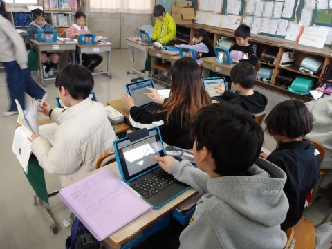 総合的な学習の時間では,自分がすてきだなと思う車いすや白杖のことについて,タブレットで調べたり,まとめたりしています。