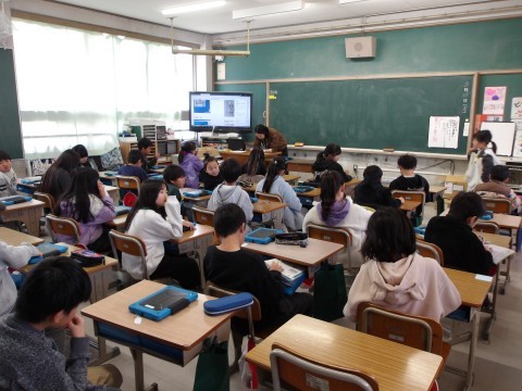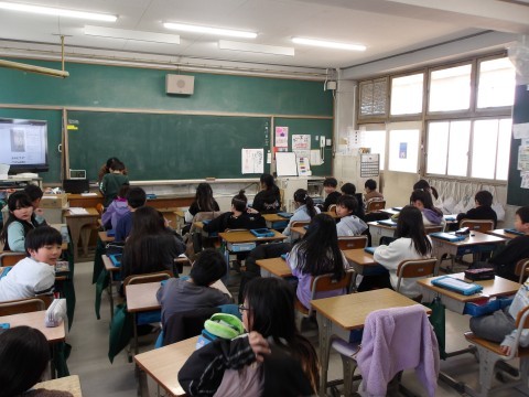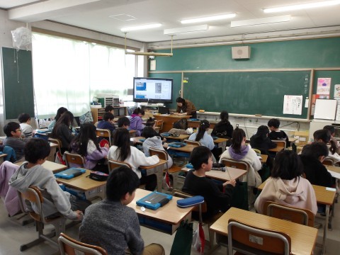 新しく配られた、タブレット端末を管理するための名前のシールをji自分で貼っています。終わった人は,タイピングの練習をしています。