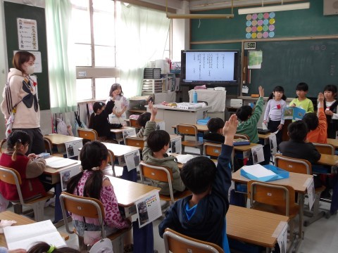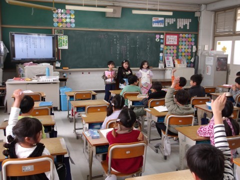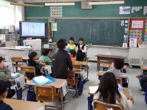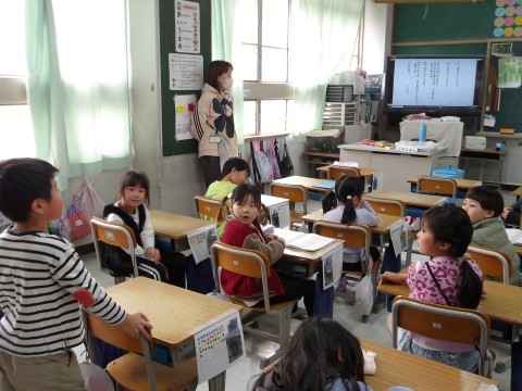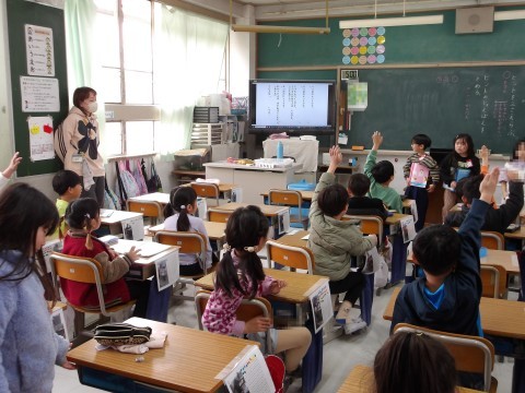 国語では,「これはなんでしょう」をみんなに投げかけ,答えてもらいます。予めヒントを考えたり,ヒントを出す順番を考えたりして準備して取り組んでいます。「ヒント1:字が書いてある」「ヒント2:四角い」とヒントをだしたところでみんなに答えてもらいます。正解がでないと,みんなが質問し,それに答えます。そして,「ヒント3:授業で使う」と出すと,正解がでました。先生は,「ポイントは,ヒントを聞いて質問するとき,他の人が質問した内容と違うことを質問するといいですね。」と説明をし,質問内容を工夫することを伝えています。