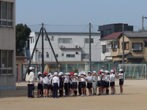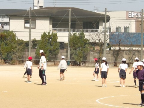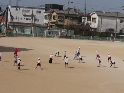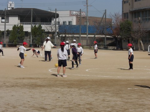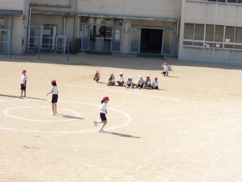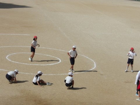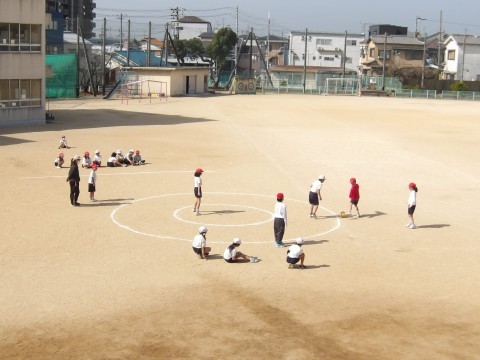体育では,「サークルシュートゲーム」に取り組んでいます。相手の位置をよく見て,隙間を見つけてボールをつないでいきます。