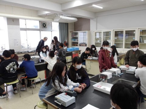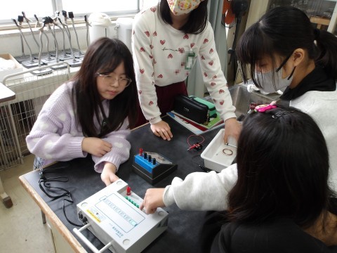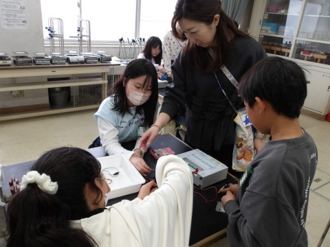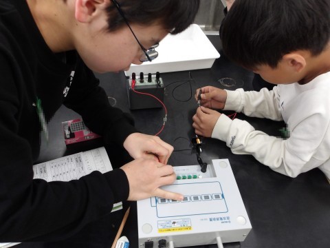 理科では,電磁石を強くするにはどうすればよいかを考えます。電流の大きさを変えたり,コイルの巻き数を変えたりと条件を変えて実験して確かめます。