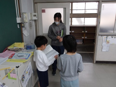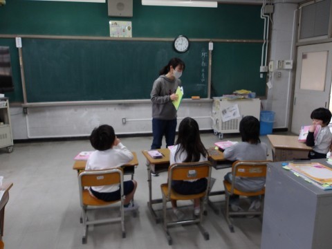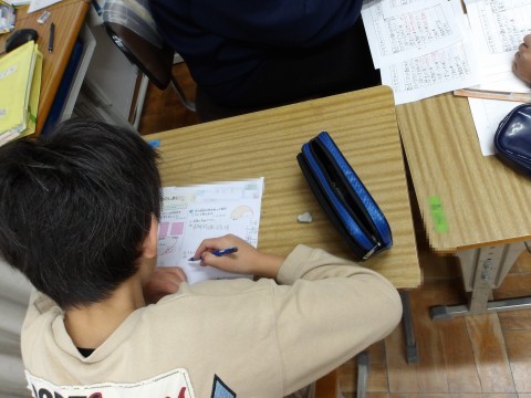 あおぞら学級での,1年生が「「これはなんでしょう」の発表をします。各自がそれぞれの学年の学習を行い,ゆっくりと自分のペースを守ることで,落ち着いて取り組んでいます。
