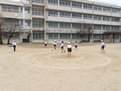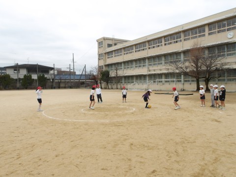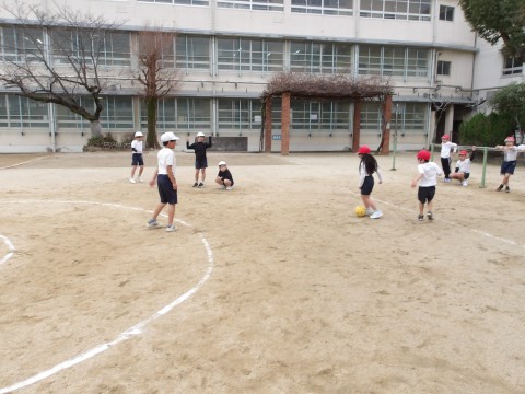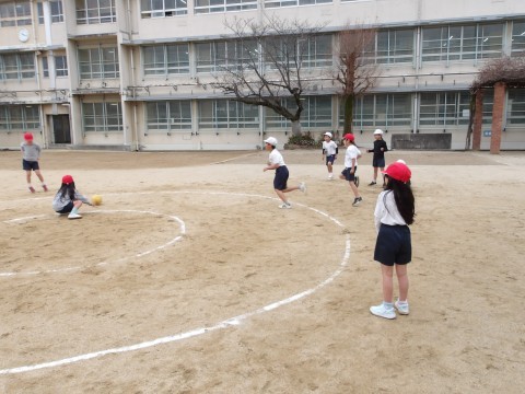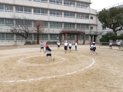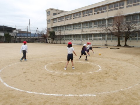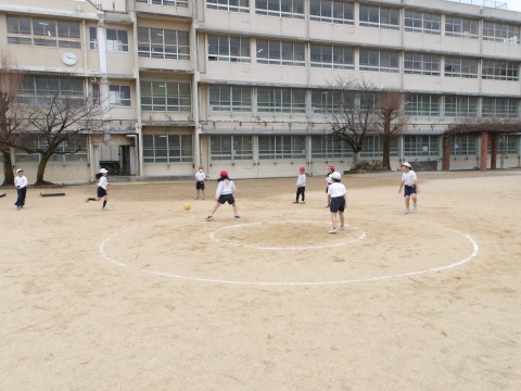 運動場の体育では,グループに分かれてキックサークルシュートゲームの試合が行われています。うまくずれを作ってパスを回しています。