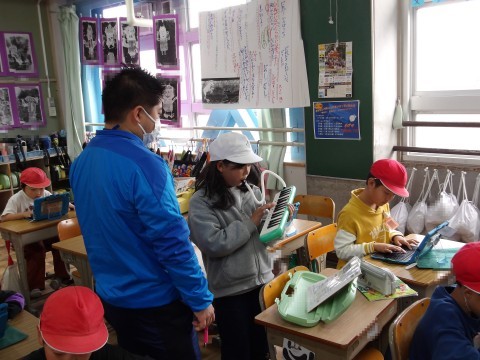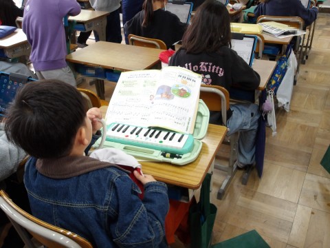 音楽では「子ぐまの二月」の鍵盤ハーモニカのテストが行われています。音がスムーズに出ているか,指使い,息の吹き方などに注意しながら演奏します。