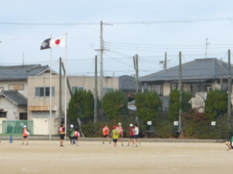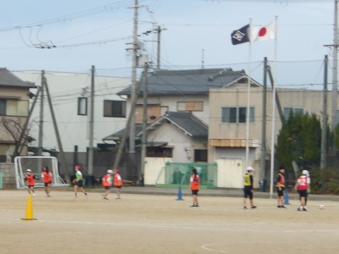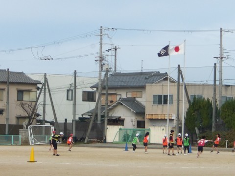 運動場の体育では,サッカーの試合が行われています。今日は気温も高く,よく体も動いています。