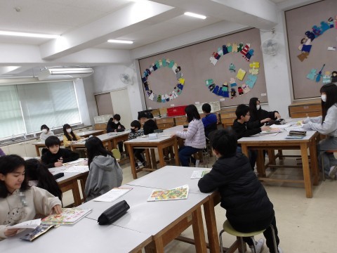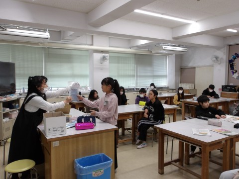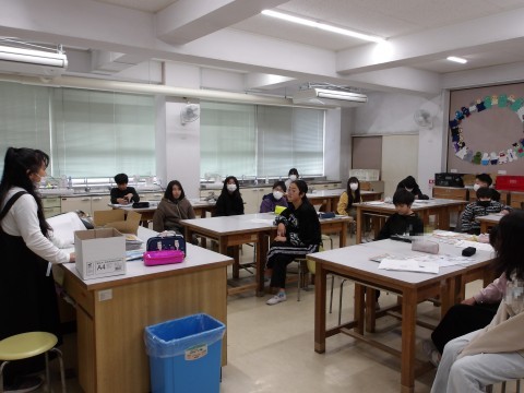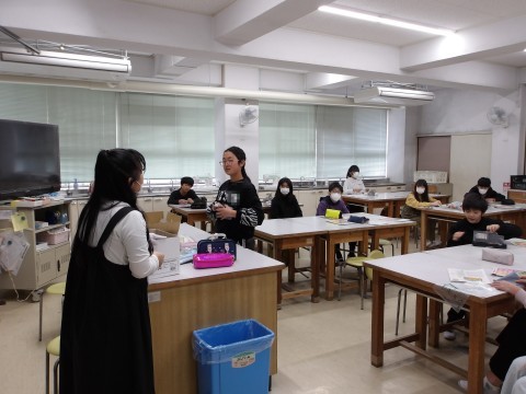 家庭科では,今年度最後の授業です。単元テストが返却され、間違えた所を復習しています。また,制作したティッシュポーチが返却されています。