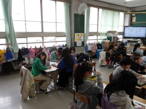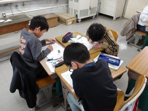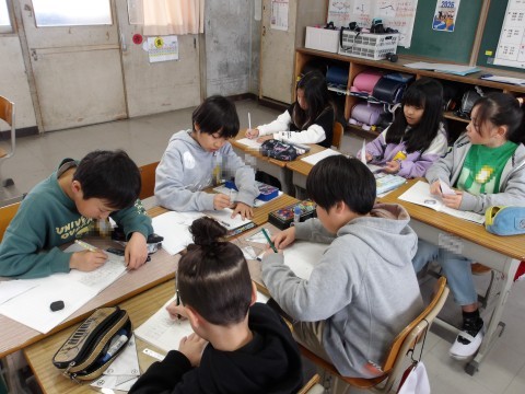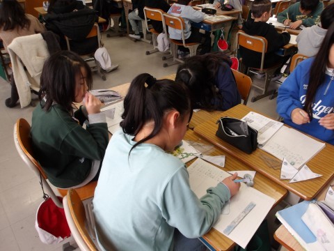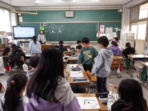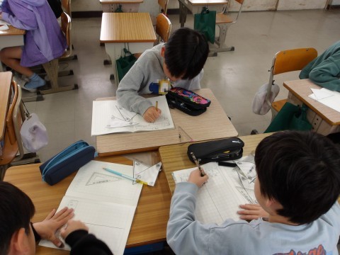 算数では,二等辺三角形・正三角形の角の大きさをグループで調べます。