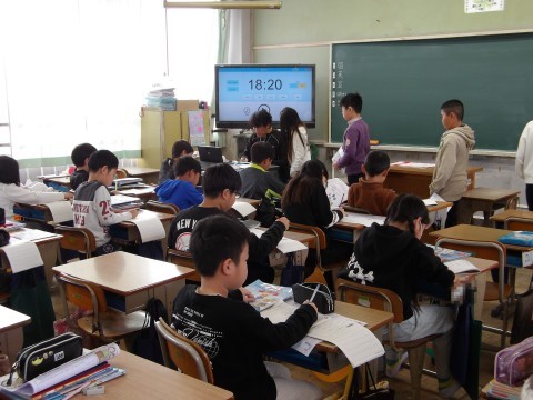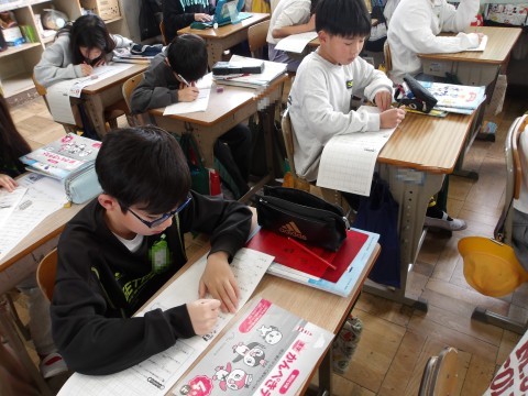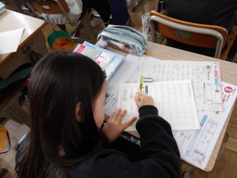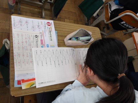 4年生の漢字50問テストが返却され,やり直しの後は,次の漢字のシートに取り組みます。