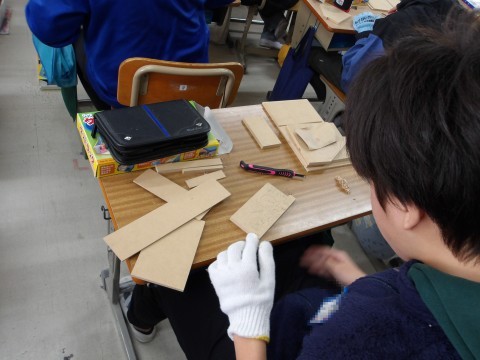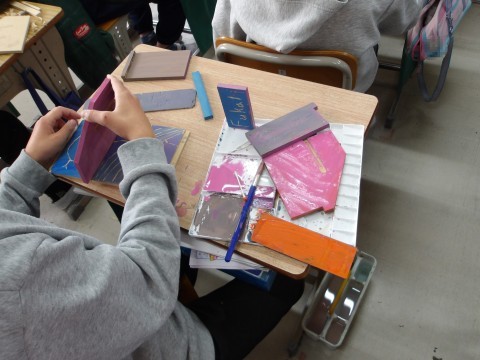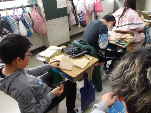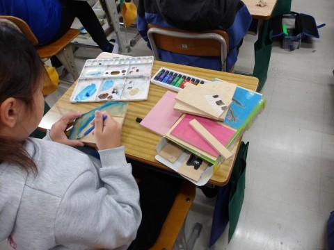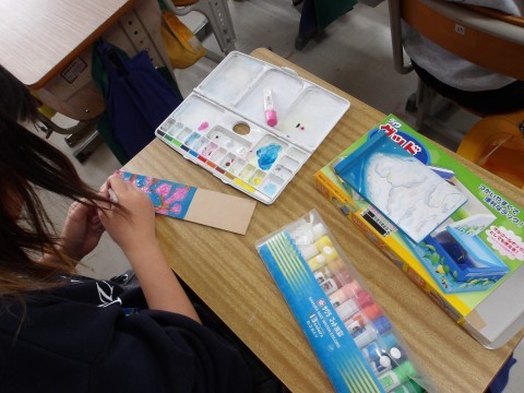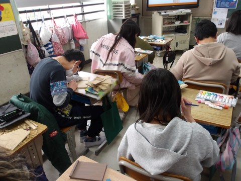 図工「グッドラック」を制作しています。彫刻刀で丁寧に彫って色を付けます。