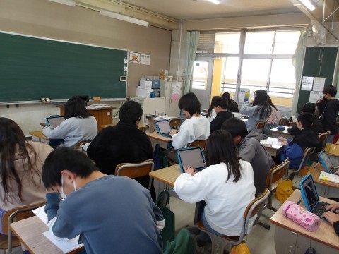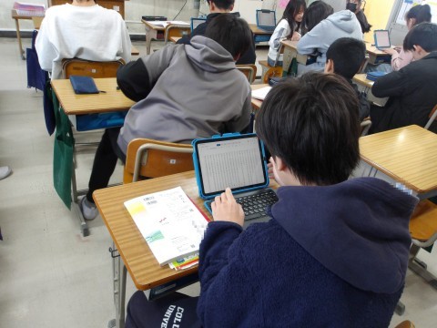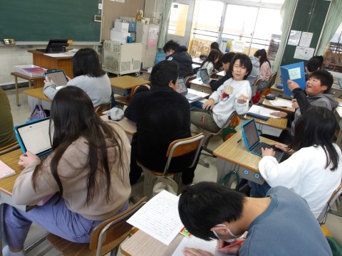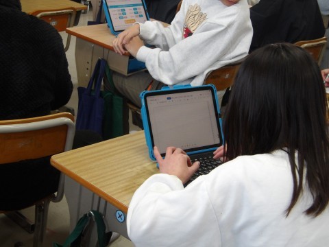 卒業文集に載せる作文を書いています。手書きで書いている人やWordで書いている人など,様式はさまざまです。