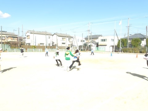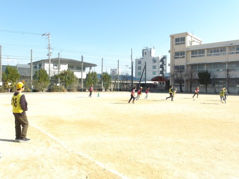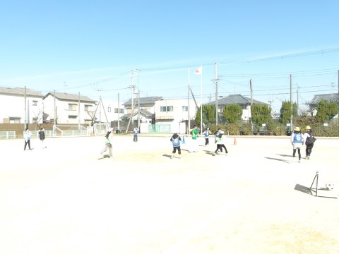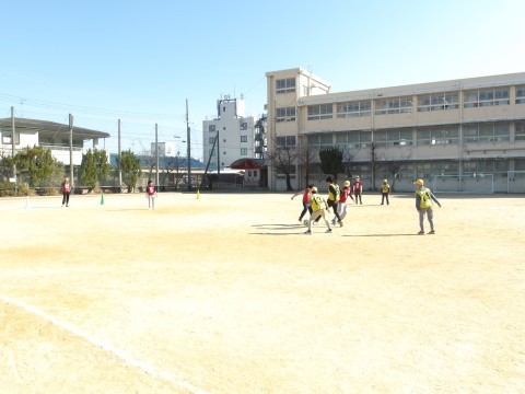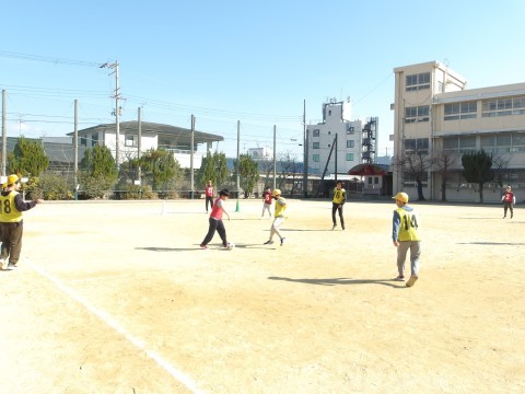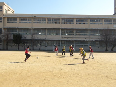 体育では,ラインサッカーに取り組んでいます。味方によいパスを送ることを意識して試合をしています。