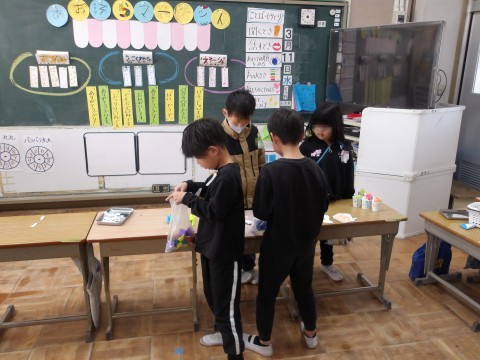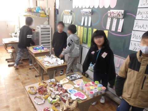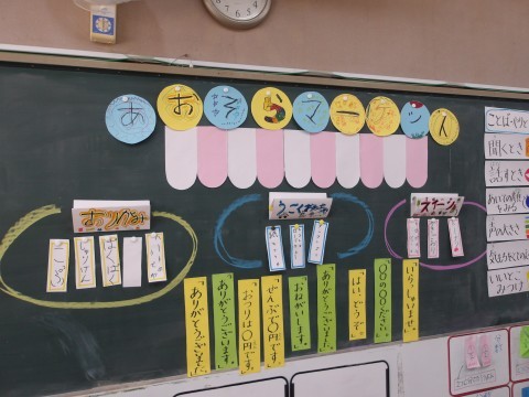 あおぞらマーケットが開催されています。お金を支払って,自分が買いたい品物を買っています。楽しく算数の学習をしてイアス。