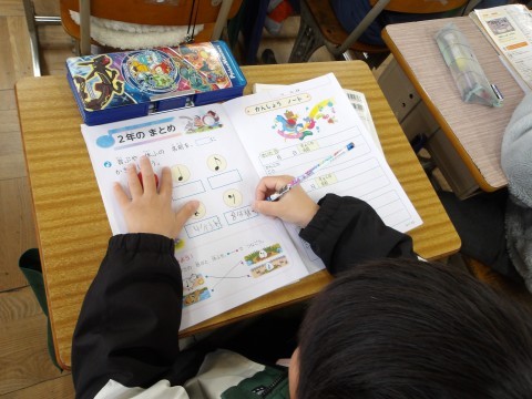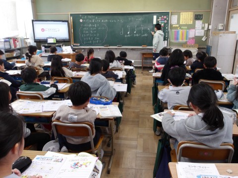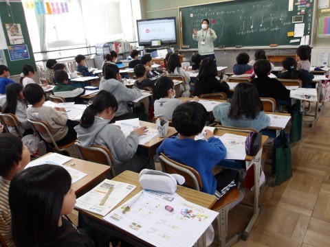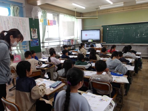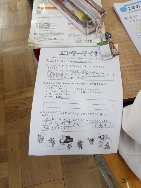 音楽では,「エンターテイナー」を鑑賞して,気づいたことや感想を可ワークシートにまとめています。また,2年生のまとめをしています。音符や休符の名前も確認しています。