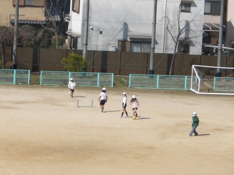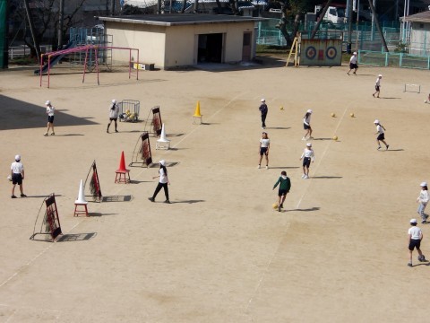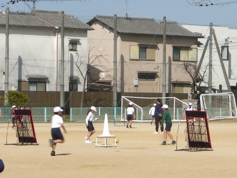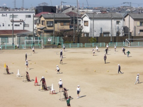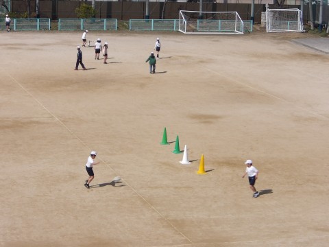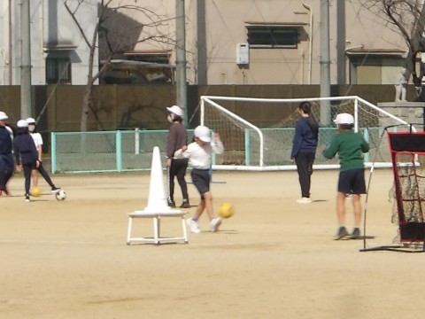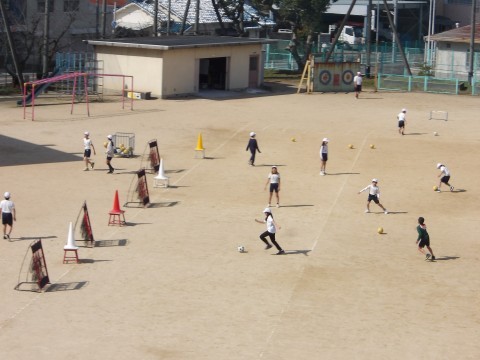 運動場の体育では,ラインサッカーに取り組んでいます。試合の前に,いろいろな技術練習ができる場の設定をしたところを,各自で順にまわって取り組みます。