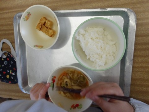 今日の献立「高野豆腐のからあげ」では,高野豆腐は,一度凍らせて乾燥させたもので,水に戻した後だし汁で煮込んであじを付けます。今日は,片栗粉をまぶして,油で揚げています。たくさんの人がお代わりをするくらいの人気ぶりです。