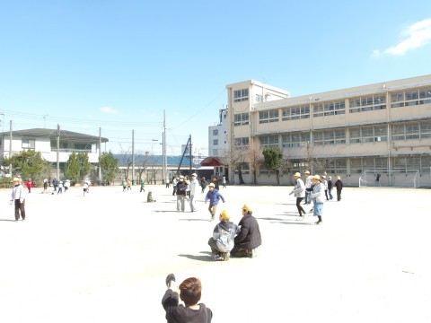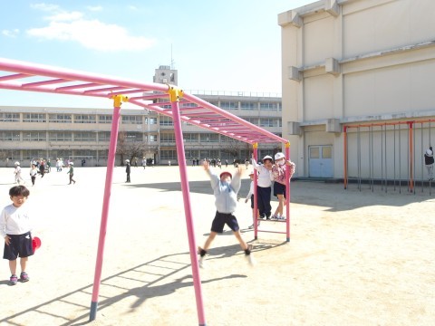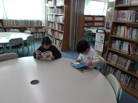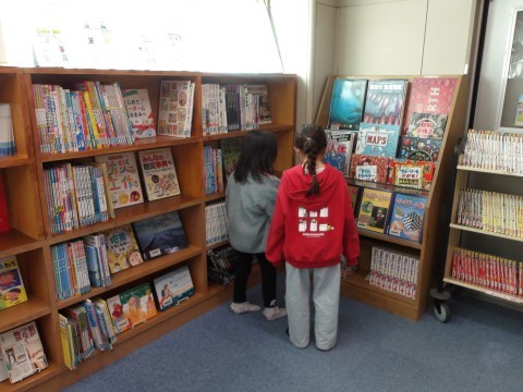 運動場では,子どもたちがドッジボールなどをして、元気に体を動かして遊んでいます。図書室では,お気に入りの本を見つけて,静かに読んでいます。