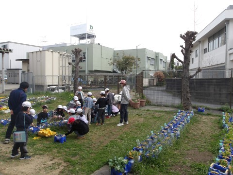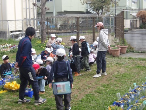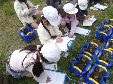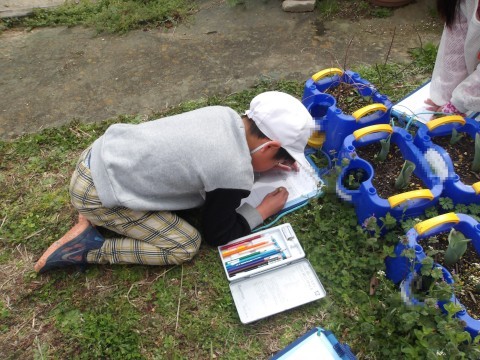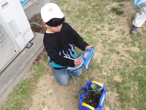 生活科で育てているチューリップに観察をしています。大きさを確かめたり,触ったりして成長の記録を書きます。大きくなりましたね。