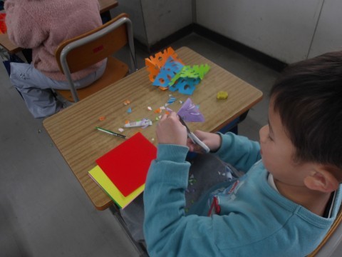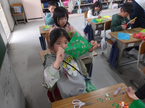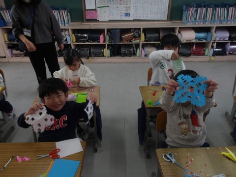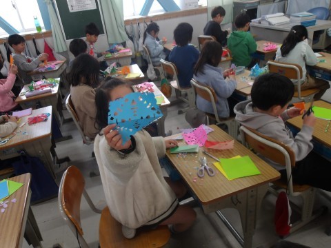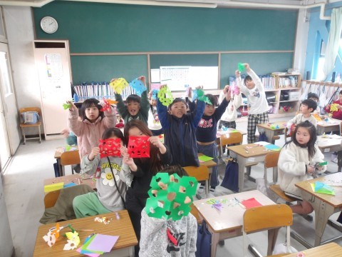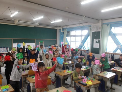 1-1 図工 公開日 2026/03/10 更新日 2026/03/10 1年生 「チョッキン アート」の学習です。一人ひとりオリジナルの作品ができ上がりました。最後にみんなで記念撮影です! +4 1年生