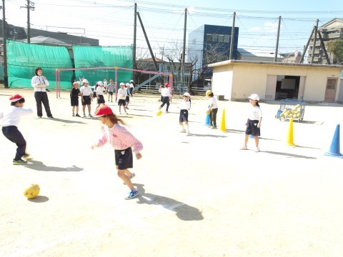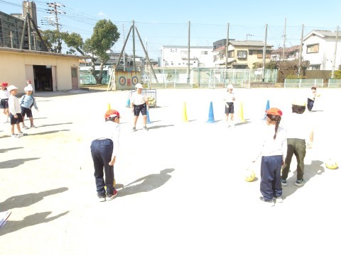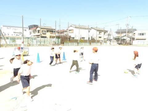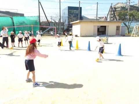 体育では,「ボール蹴りゲーム」に取り組んでいます。シュートが決まるようにするにはどうしたらよいかを考えながらボールを蹴ります。