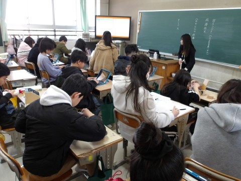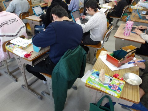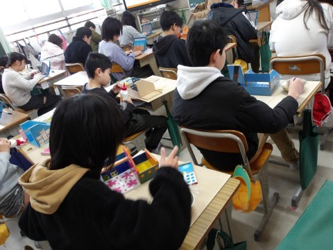 卒業制作「グッドラック」にニスを塗って、仕上げています。仕上がった人は、タイピング練習をしています。