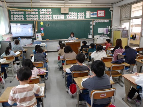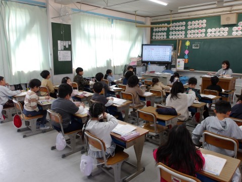 算数では,たし算やひき算の問題を先生と一緒に解いて、答え合わせをしてます。