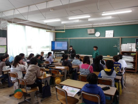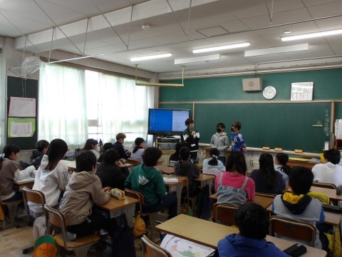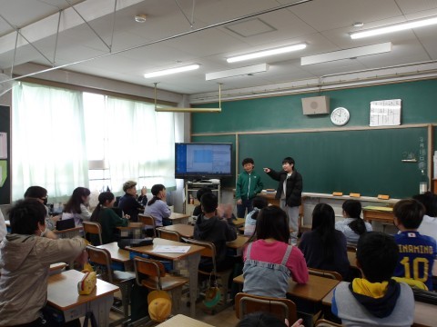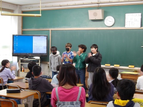 木曜日に交流する、年生とのお笑い対決で披露する、漫才を練習しています。先生が丁寧に指導しています。