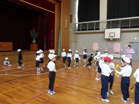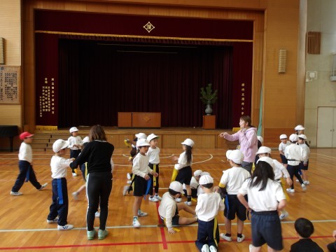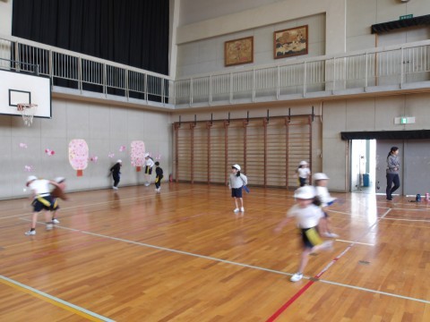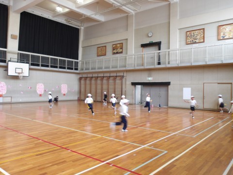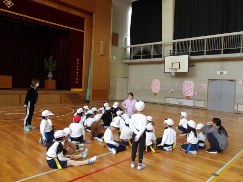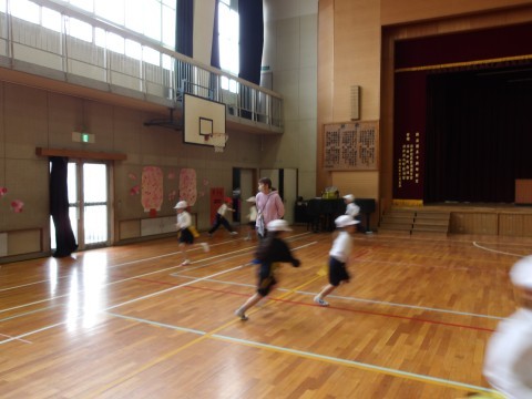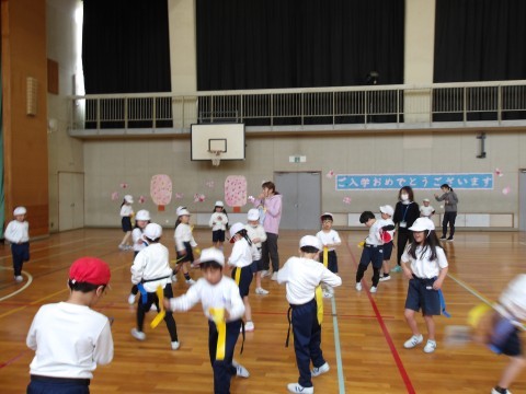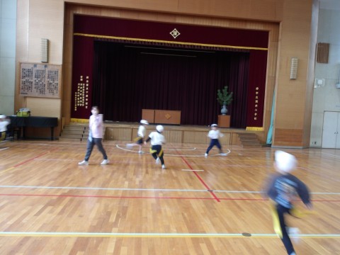 体育では,しっぽとりゲームをしています。元気に走り回って,しっぽを追いかけています。
