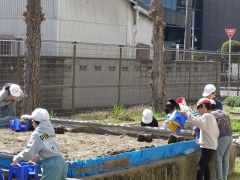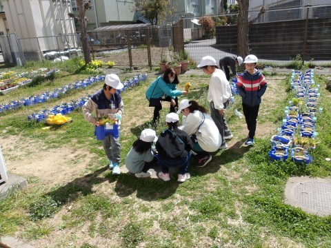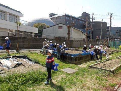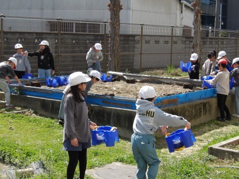 生活科では,育て終わった鉢の土を取り出して,3年生で使えるように,片づけています。