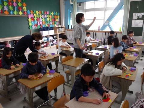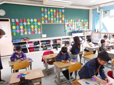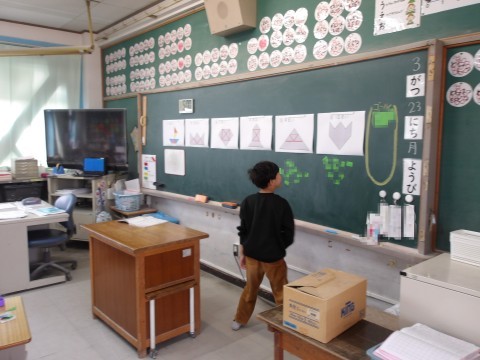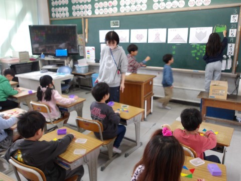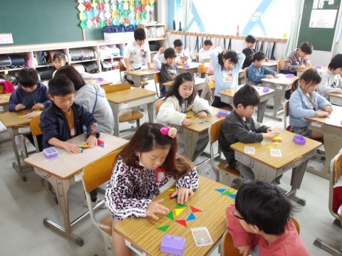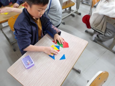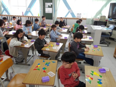 算数では,先生が黒板に貼った形どおりに,自分で作ってみます。使う三角カードも枚数に気を付けて,工夫をしながら同じ形をつくります。