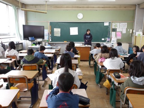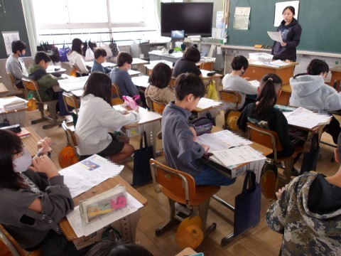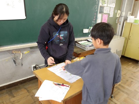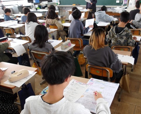 算数「直方体と立方体」の単元テストが返却されています。先生が,間違えやすかったところを解説しています。自分でやり直しが終わった人から先生に見てもらいます。