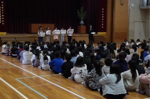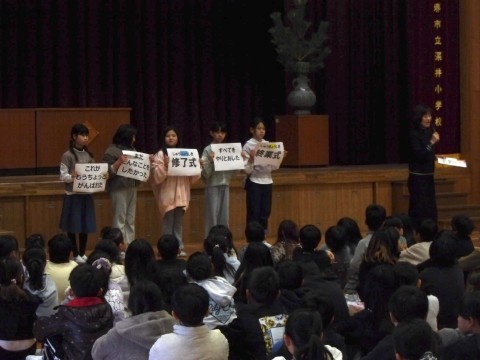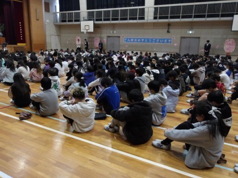 令和7年度修了式が,行われました。校長先生からは,「1・2学期の終わりは終業式ですが,3学期は修了式と言います。終わったのではなく,納めたという意味で,“それぞれの学年で,教わったり経験したりする学習や行事をすべてやり通した”ということを表します。立派に成長しましたね。なりたい自分になれましたか。この1年を振り返って,“まだ自分はできることがあったのではないか”と思った人は,それを忘れないでほしいと思います。この後,担任の先生から通知表を受け取ります。先生と1年間の成長を振り返り,お家に帰ってからも,通知表を見ながら応つの人と一緒に振り返ってほしいと思います。そして,その成長を,新学年で活かしましょう。」と話がありました。