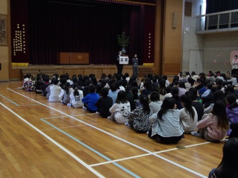 生徒指導担当の先生からは,春休みの過ごし方について,「お金の貸し借りはしない,安全に気を付けること。そして,言葉の使い方は人を傷付けることもあることを知っておきましょう。漢字の通り,葉っぱは一度地面に落ちれば元に戻れません。言葉も同じです。人を傷つけていないかよく考えて使うようにしましょう。間違って使っていたら勇気をもって止めることが友だちですよ。」と,話がありました。