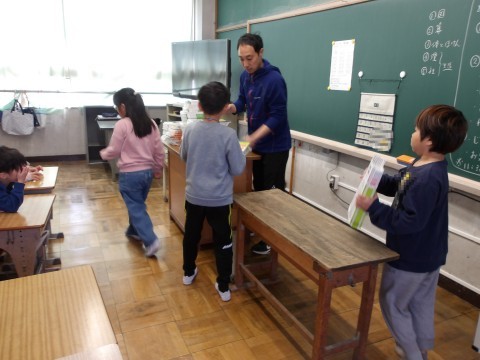 新しい教科書を取りに行き,,この後,先生から1冊ずつ配られます。3年生は,新しく理科の学習が始まります。どんな学習が始まるのか,楽しみですね。