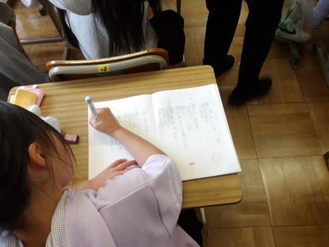 連絡帳を書いています。丁寧に書いていますね。