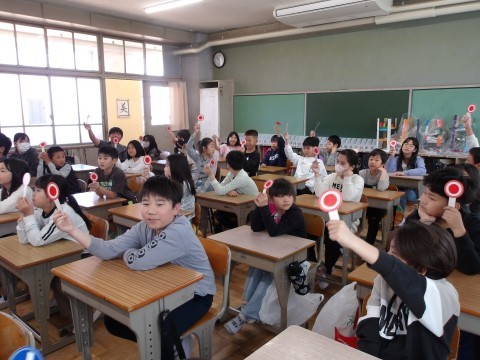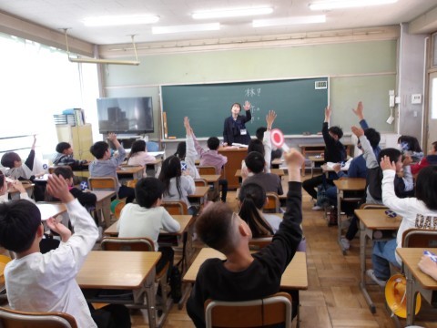 担任の先生にまつわるクイズで,学級開きが行われています。何問正解できたかな?