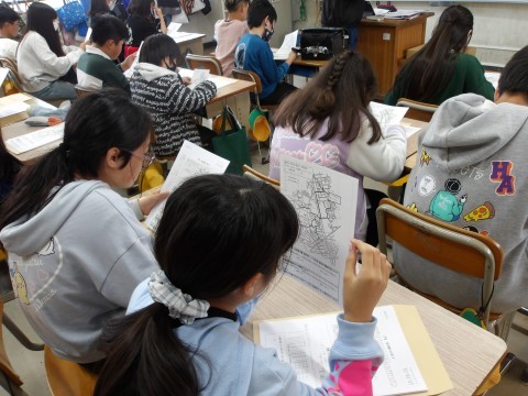 配布物の中に入っている通学路の確認をしています。さっそく明日から,1年生のお世話をします。よろしくお願いしますね。