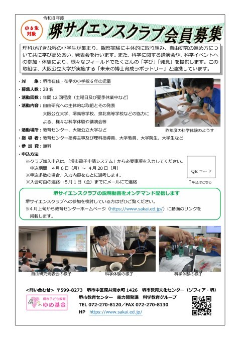 「堺サイエンスクラブ」は堺市教育委員会が主催の活動で、理科が好きな堺の小学6年生が集まり、