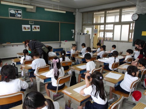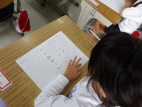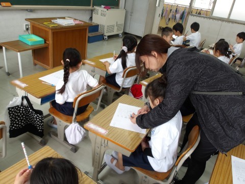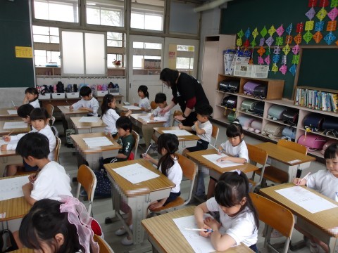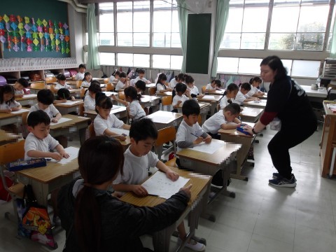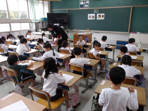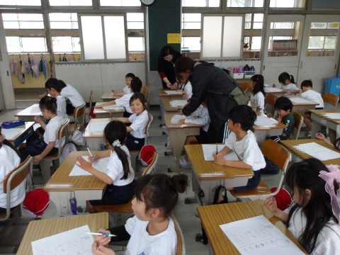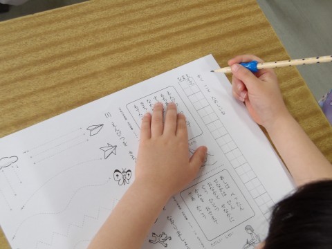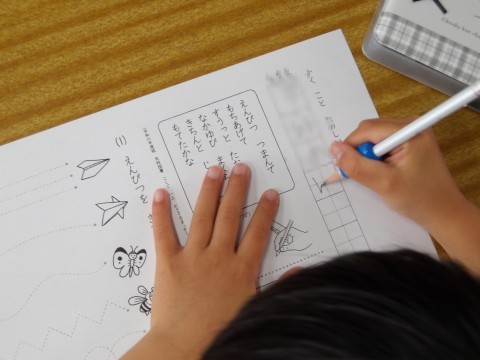 えんぴつの持ち方を練習しています。つまんで持ち上げ,すっと倒して中指をまくらにして持ちます。きちんと持てたら,自分の名前を名字から書きます。鉛筆の持ち方も大事ですが,しっかりと足を付けてよい姿勢をとることも大事ですよ。