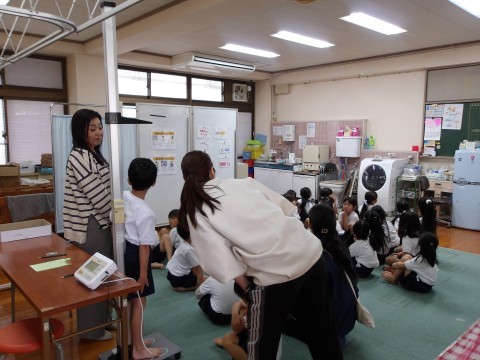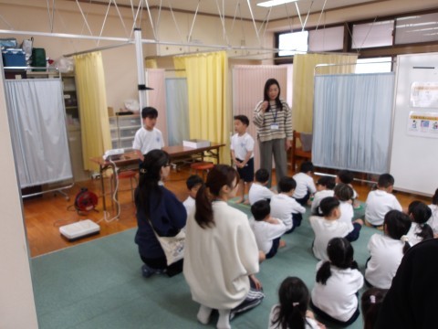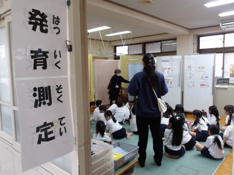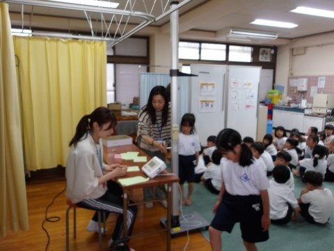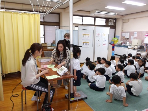 はじめての2測定(発育測定)が行われています。保健室の先生のお話をしっかりと聞いて,測定しています。身長と体重はどのくらいだったかな?
