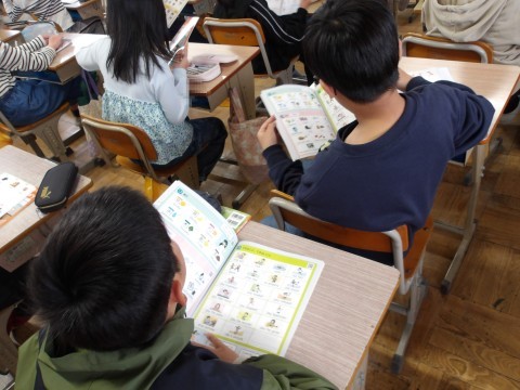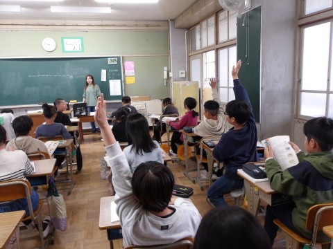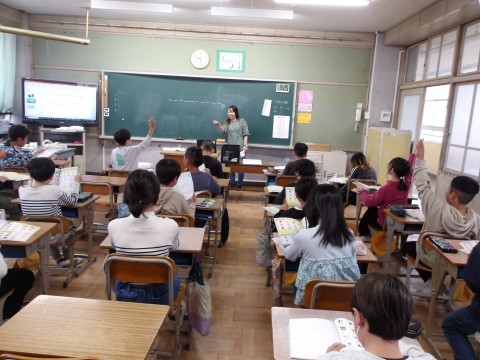 高学年英語の授業では,深井西小学校の外国語担当の先生と学びます。今日は,先生が問題を出した答えにあてはまる単語をあてます。ただし,文字数は指定されていますよ。わかるかな?