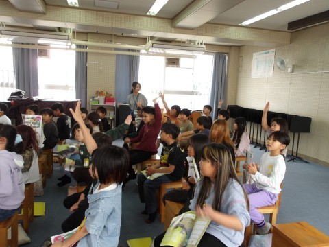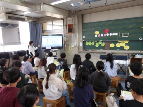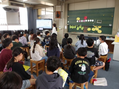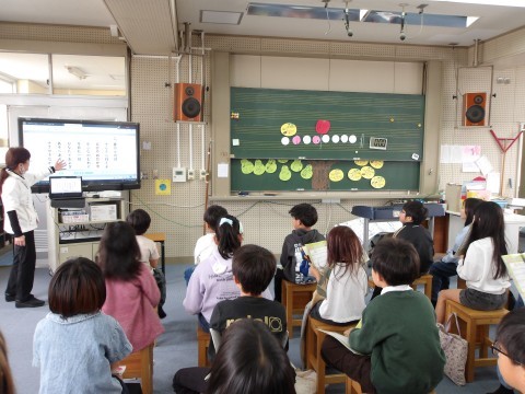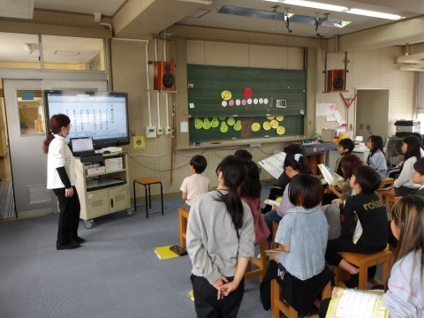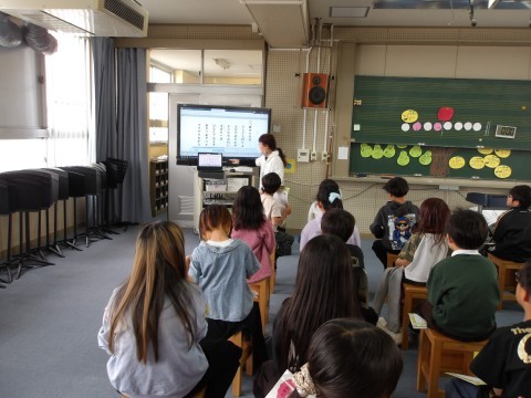 音楽の学習は,音楽室で行います。「春の小川」の歌詞について,先生が説明をしています。歌詞から春の様子を感じ取って,歌います。