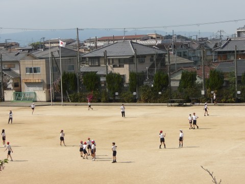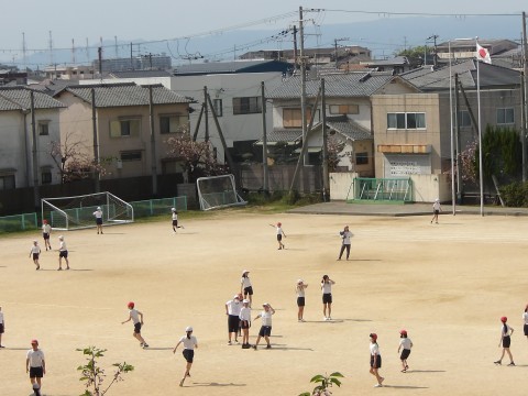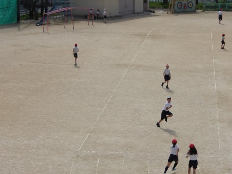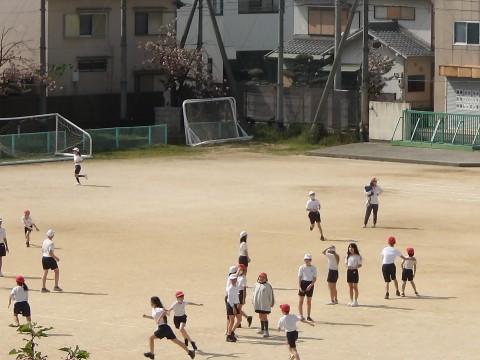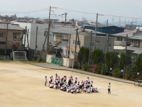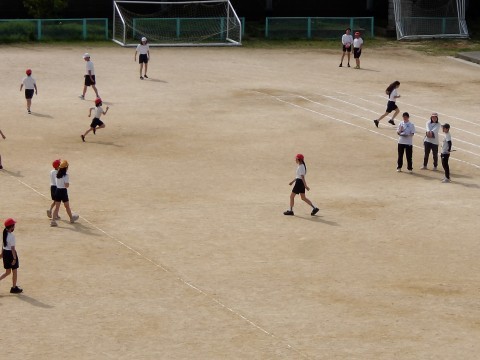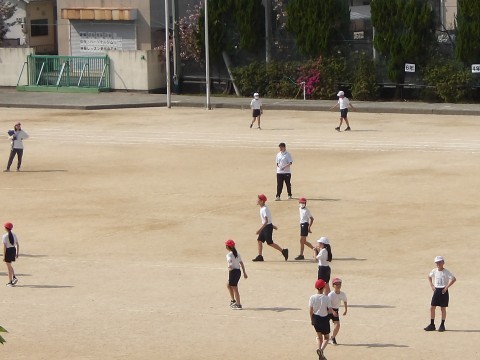 学年で50メートル走を測定した後,学年遊びをしています。元気よく体を動かしています。